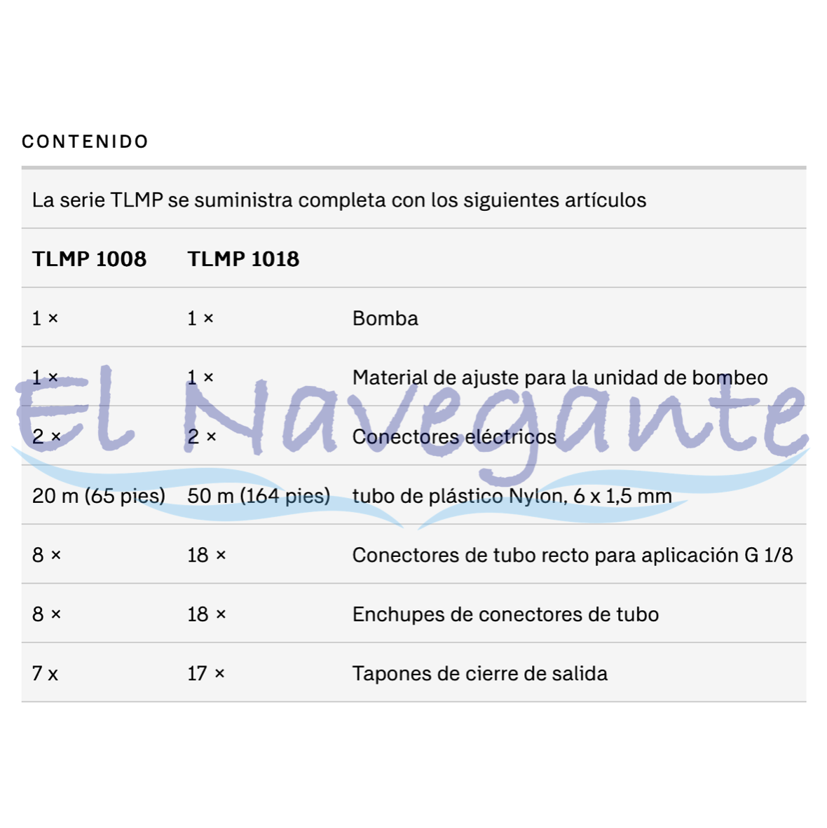| Contenido | 1 bomba TLMP 1018/230 V juego de material de conexión 2 conectores eléctricos 1 tubo de plástico de 50 m de nailon 6 x 1,5 mm 18 conectores de tubo rectos 18 tapones para conectores de tubo 17 tapones de cierre de salida. |